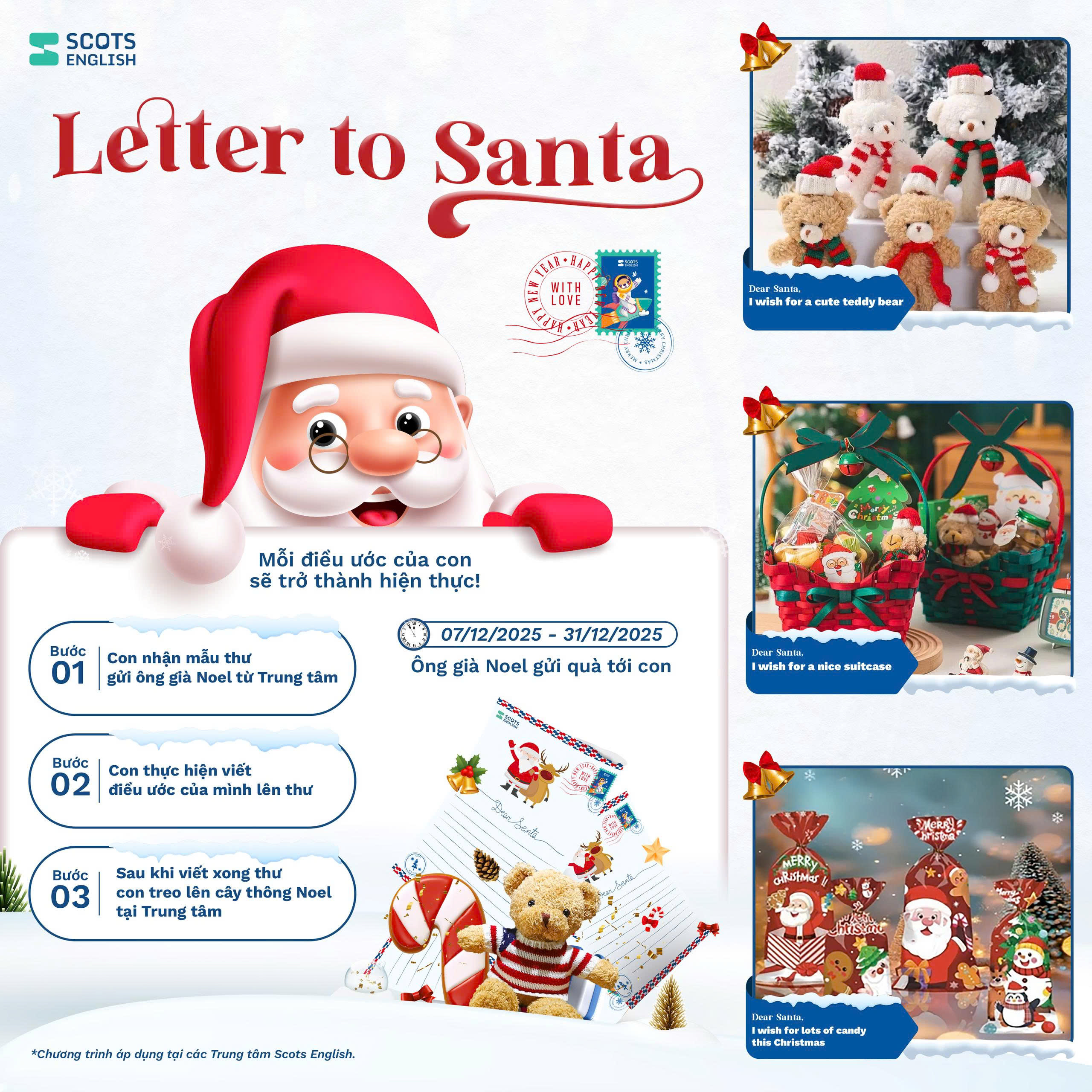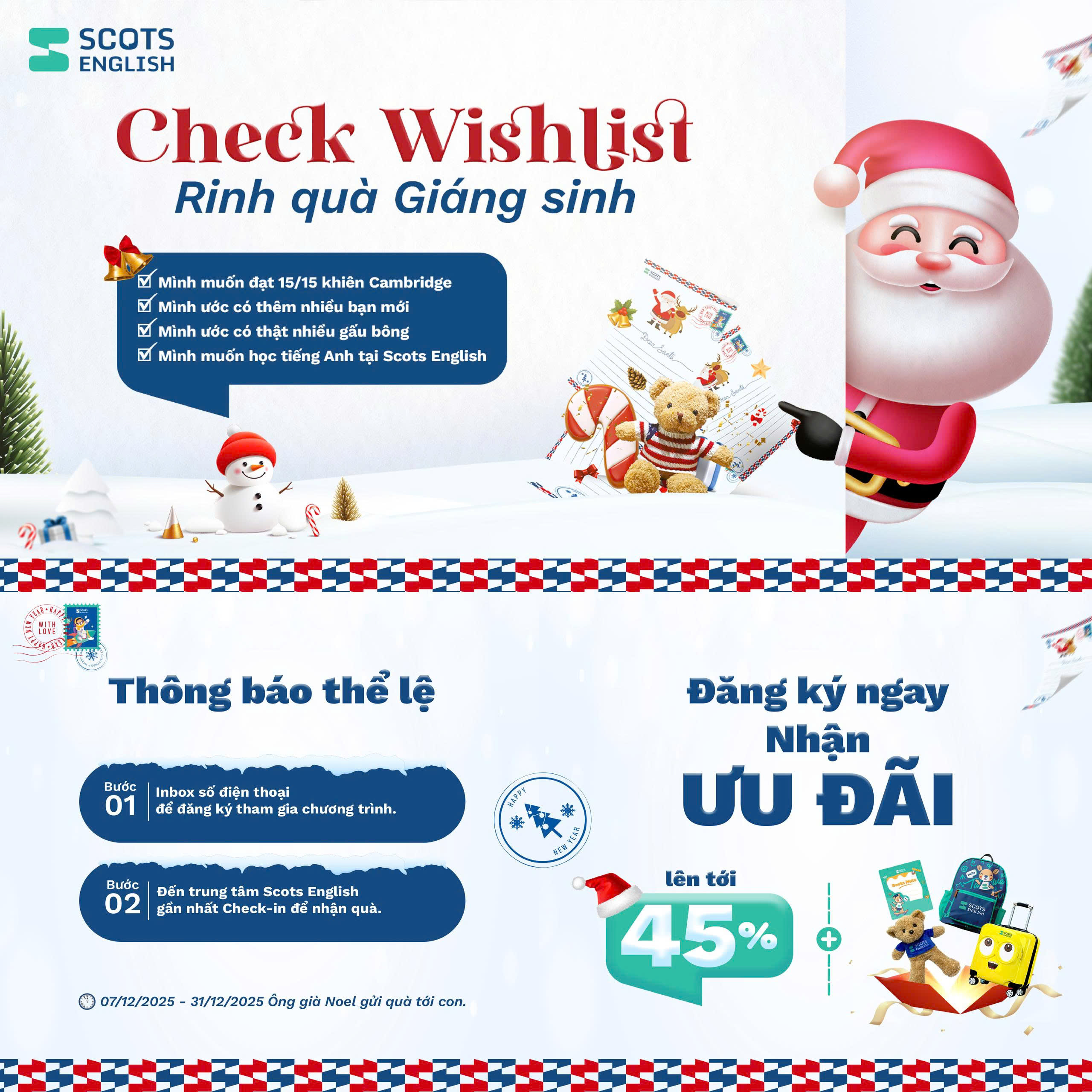 Ba mẹ đừng bỏ lỡ cơ hội để con tham gia The Christmas Wish, trải nghiệm Giáng sinh ngập tràn niềm vui và yêu thương tại Scots English. Đây là cơ hội lý tưởng để ba mẹ vừa tạo một mùa Giáng sinh trọn vẹn cảm xúc, vừa đầu tư cho nền tảng tiếng Anh vững chắc của con trong tương lai.